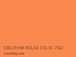 CIELCh 68.602,62.132,51.742 Color is a light orange color and the nearest color is Coral #ff7f50. Hex code #fa8950 and RGB value is rgb(250,137,80). In RGB color space, this color is composed of 98% red, 54% green, 31% blue, In CMYK color space, this color is composed of 0% cyan, 45% magenta, 68% yellow , 2% black , In HSL color space, this color has a hue angle of 20° , 94% saturation and 65% lightness.
