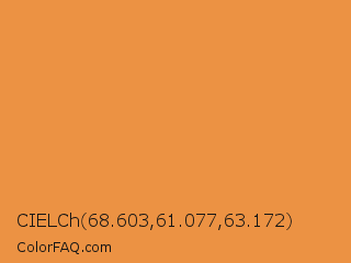 CIELCh 68.603,61.077,63.172 Color is a normal orange color and the nearest color is Jaffa #ef863f. Hex code #ec9243 and RGB value is rgb(236,146,67). In RGB color space, this color is composed of 93% red, 57% green, 26% blue, In CMYK color space, this color is composed of 0% cyan, 38% magenta, 72% yellow , 7% black , In HSL color space, this color has a hue angle of 28° , 82% saturation and 59% lightness.