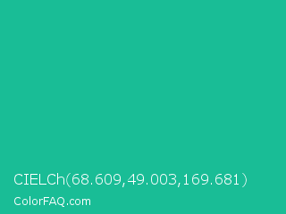 CIELCh 68.609,49.003,169.681 Color is a normal cyan color and the nearest color is Mountain Meadow Crayola #1ab385. Hex code #19bd96 and RGB value is rgb(25,189,150). In RGB color space, this color is composed of 10% red, 74% green, 59% blue, In CMYK color space, this color is composed of 87% cyan, 0% magenta, 21% yellow , 26% black , In HSL color space, this color has a hue angle of 166° , 77% saturation and 42% lightness.