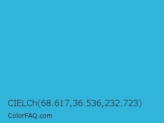 CIELCh 68.617,36.536,232.723 Color is a normal cyan color and the nearest color is Scooter #2ebfd4. Hex code #31b5db and RGB value is rgb(49,181,219). In RGB color space, this color is composed of 19% red, 71% green, 86% blue, In CMYK color space, this color is composed of 78% cyan, 17% magenta, 0% yellow , 14% black , In HSL color space, this color has a hue angle of 193° , 70% saturation and 53% lightness.