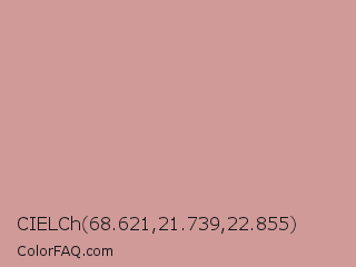 CIELCh 68.621,21.739,22.855 Color is a light red color and the nearest color is Eunry #cfa39d. Hex code #d09a99 and RGB value is rgb(208,154,153). In RGB color space, this color is composed of 82% red, 60% green, 60% blue, In CMYK color space, this color is composed of 0% cyan, 26% magenta, 26% yellow , 18% black , In HSL color space, this color has a hue angle of 1° , 37% saturation and 71% lightness.