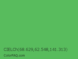 CIELCh 68.629,62.548,141.313 Color is a normal green color and the nearest color is Fern #63b76c. Hex code #58bc5d and RGB value is rgb(88,188,93). In RGB color space, this color is composed of 35% red, 74% green, 36% blue, In CMYK color space, this color is composed of 53% cyan, 0% magenta, 51% yellow , 26% black , In HSL color space, this color has a hue angle of 123° , 43% saturation and 54% lightness.