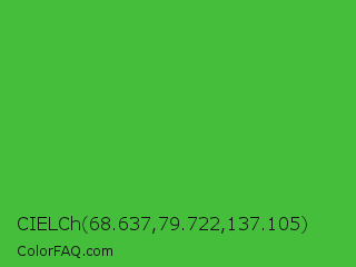 CIELCh 68.637,79.722,137.105 Color is a normal green color and the nearest color is Wageningen Green #34b233. Hex code #45bf3b and RGB value is rgb(69,191,59). In RGB color space, this color is composed of 27% red, 75% green, 23% blue, In CMYK color space, this color is composed of 64% cyan, 0% magenta, 69% yellow , 25% black , In HSL color space, this color has a hue angle of 115° , 53% saturation and 49% lightness.