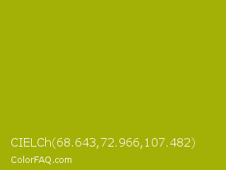 CIELCh 68.643,72.966,107.482 Color is a normal yellow color and the nearest color is Pistachio Green #9dc209. Hex code #a3b006 and RGB value is rgb(163,176,6). In RGB color space, this color is composed of 64% red, 69% green, 2% blue, In CMYK color space, this color is composed of 7% cyan, 0% magenta, 97% yellow , 31% black , In HSL color space, this color has a hue angle of 65° , 93% saturation and 36% lightness.