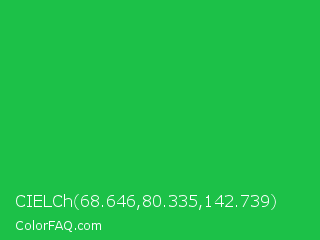 CIELCh 68.646,80.335,142.739 Color is a normal green color and the nearest color is Dark Pastel Green #03c03c. Hex code #1cc148 and RGB value is rgb(28,193,72). In RGB color space, this color is composed of 11% red, 76% green, 28% blue, In CMYK color space, this color is composed of 85% cyan, 0% magenta, 63% yellow , 24% black , In HSL color space, this color has a hue angle of 136° , 75% saturation and 43% lightness.