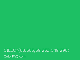 CIELCh 68.665,69.253,149.296 Color is a normal green color and the nearest color is Green Crayola #1cac78. Hex code #1dc064 and RGB value is rgb(29,192,100). In RGB color space, this color is composed of 11% red, 75% green, 39% blue, In CMYK color space, this color is composed of 85% cyan, 0% magenta, 48% yellow , 25% black , In HSL color space, this color has a hue angle of 146° , 74% saturation and 43% lightness.