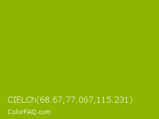 CIELCh 68.67,77.067,115.231 Color is a normal lime color and the nearest color is Apple Green #8db600. Hex code #8fb500 and RGB value is rgb(143,181,0). In RGB color space, this color is composed of 56% red, 71% green, 0% blue, In CMYK color space, this color is composed of 21% cyan, 0% magenta, 100% yellow , 29% black , In HSL color space, this color has a hue angle of 73° , 100% saturation and 35% lightness.
