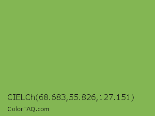 CIELCh 68.683,55.826,127.151 Color is a normal green color and the nearest color is Chelsea Cucumber #83aa5d. Hex code #83b653 and RGB value is rgb(131,182,83). In RGB color space, this color is composed of 51% red, 71% green, 33% blue, In CMYK color space, this color is composed of 28% cyan, 0% magenta, 54% yellow , 29% black , In HSL color space, this color has a hue angle of 91° , 40% saturation and 52% lightness.