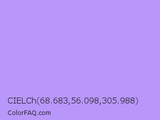 CIELCh 68.683,56.098,305.988 Color is a light indigo color and the nearest color is Biloba Flower #b2a1ea. Hex code #b896fa and RGB value is rgb(184,150,250). In RGB color space, this color is composed of 72% red, 59% green, 98% blue, In CMYK color space, this color is composed of 26% cyan, 40% magenta, 0% yellow , 2% black , In HSL color space, this color has a hue angle of 260° , 91% saturation and 78% lightness.
