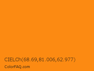 CIELCh 68.69,81.006,62.977 Color is a normal orange color and the nearest color is West Side #ff910f. Hex code #fc8a12 and RGB value is rgb(252,138,18). In RGB color space, this color is composed of 99% red, 54% green, 7% blue, In CMYK color space, this color is composed of 0% cyan, 45% magenta, 93% yellow , 1% black , In HSL color space, this color has a hue angle of 31° , 98% saturation and 53% lightness.