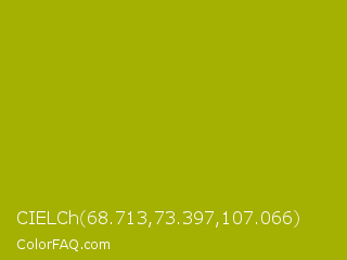 CIELCh 68.713,73.397,107.066 Color is a normal yellow color and the nearest color is Pistachio Green #9dc209. Hex code #a4b002 and RGB value is rgb(164,176,2). In RGB color space, this color is composed of 64% red, 69% green, 1% blue, In CMYK color space, this color is composed of 7% cyan, 0% magenta, 99% yellow , 31% black , In HSL color space, this color has a hue angle of 64° , 98% saturation and 35% lightness.