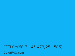 CIELCh 68.71,45.473,251.585 Color is a normal blue color and the nearest color is Spiro Disco Ball #0fc0fc. Hex code #10b3f5 and RGB value is rgb(16,179,245). In RGB color space, this color is composed of 6% red, 70% green, 96% blue, In CMYK color space, this color is composed of 93% cyan, 27% magenta, 0% yellow , 4% black , In HSL color space, this color has a hue angle of 197° , 92% saturation and 51% lightness.