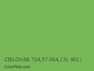 CIELCh 68.724,57.064,131.901 Color is a normal green color and the nearest color is Bud Green #7bb661. Hex code #78b857 and RGB value is rgb(120,184,87). In RGB color space, this color is composed of 47% red, 72% green, 34% blue, In CMYK color space, this color is composed of 35% cyan, 0% magenta, 53% yellow , 28% black , In HSL color space, this color has a hue angle of 100° , 41% saturation and 53% lightness.