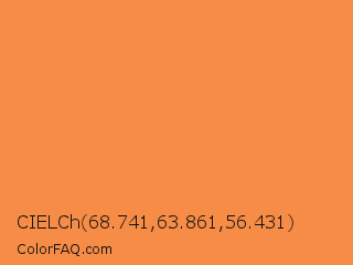 CIELCh 68.741,63.861,56.431 Color is a light orange color and the nearest color is Jaffa #ef863f. Hex code #f78c47 and RGB value is rgb(247,140,71). In RGB color space, this color is composed of 97% red, 55% green, 28% blue, In CMYK color space, this color is composed of 0% cyan, 43% magenta, 71% yellow , 3% black , In HSL color space, this color has a hue angle of 24° , 92% saturation and 62% lightness.