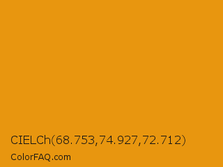 CIELCh 68.753,74.927,72.712 Color is a normal orange color and the nearest color is Gamboge #e49b0f. Hex code #e8960f and RGB value is rgb(232,150,15). In RGB color space, this color is composed of 91% red, 59% green, 6% blue, In CMYK color space, this color is composed of 0% cyan, 35% magenta, 94% yellow , 9% black , In HSL color space, this color has a hue angle of 37° , 88% saturation and 48% lightness.