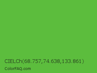 CIELCh 68.757,74.638,133.861 Color is a normal green color and the nearest color is Green RYB #66b032. Hex code #5cbd3d and RGB value is rgb(92,189,61). In RGB color space, this color is composed of 36% red, 74% green, 24% blue, In CMYK color space, this color is composed of 51% cyan, 0% magenta, 68% yellow , 26% black , In HSL color space, this color has a hue angle of 105° , 51% saturation and 49% lightness.