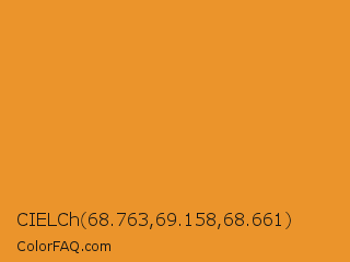 CIELCh 68.763,69.158,68.661 Color is a normal orange color and the nearest color is Fire Bush #e89928. Hex code #eb942b and RGB value is rgb(235,148,43). In RGB color space, this color is composed of 92% red, 58% green, 17% blue, In CMYK color space, this color is composed of 0% cyan, 37% magenta, 82% yellow , 8% black , In HSL color space, this color has a hue angle of 33° , 83% saturation and 55% lightness.