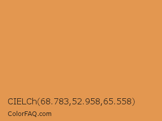 CIELCh 68.783,52.958,65.558 Color is a normal orange color and the nearest color is Big Foot Feet #e88e5a. Hex code #e39750 and RGB value is rgb(227,151,80). In RGB color space, this color is composed of 89% red, 59% green, 31% blue, In CMYK color space, this color is composed of 0% cyan, 33% magenta, 65% yellow , 11% black , In HSL color space, this color has a hue angle of 29° , 72% saturation and 60% lightness.