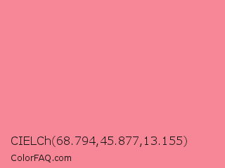 CIELCh 68.794,45.877,13.155 Color is a light red color and the nearest color is Tulip #ff878d. Hex code #f78697 and RGB value is rgb(247,134,151). In RGB color space, this color is composed of 97% red, 53% green, 59% blue, In CMYK color space, this color is composed of 0% cyan, 46% magenta, 39% yellow , 3% black , In HSL color space, this color has a hue angle of 351° , 88% saturation and 75% lightness.