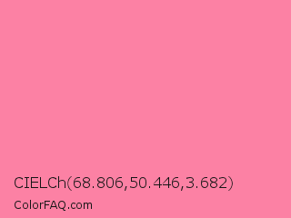 CIELCh 68.806,50.446,3.682 Color is a light rose color and the nearest color is Tickle Me Pink Crayola #fc80a5. Hex code #fc81a4 and RGB value is rgb(252,129,164). In RGB color space, this color is composed of 99% red, 51% green, 64% blue, In CMYK color space, this color is composed of 0% cyan, 49% magenta, 35% yellow , 1% black , In HSL color space, this color has a hue angle of 343° , 95% saturation and 75% lightness.