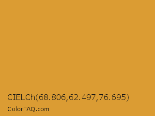 CIELCh 68.806,62.497,76.695 Color is a normal orange color and the nearest color is Satin Sheen Gold #cba135. Hex code #db9c33 and RGB value is rgb(219,156,51). In RGB color space, this color is composed of 86% red, 61% green, 20% blue, In CMYK color space, this color is composed of 0% cyan, 29% magenta, 77% yellow , 14% black , In HSL color space, this color has a hue angle of 38° , 70% saturation and 53% lightness.