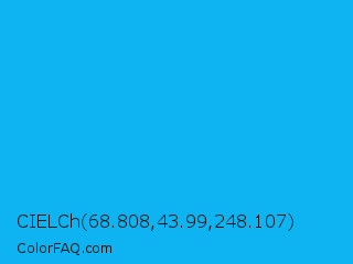CIELCh 68.808,43.99,248.107 Color is a normal blue color and the nearest color is Cyan Process #00b7eb. Hex code #0db4f1 and RGB value is rgb(13,180,241). In RGB color space, this color is composed of 5% red, 71% green, 95% blue, In CMYK color space, this color is composed of 95% cyan, 25% magenta, 0% yellow , 5% black , In HSL color space, this color has a hue angle of 196° , 90% saturation and 50% lightness.