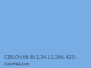 CIELCh 68.812,34.12,266.423 Color is a light blue color and the nearest color is Aero #7cb9e8. Hex code #77ace5 and RGB value is rgb(119,172,229). In RGB color space, this color is composed of 47% red, 67% green, 90% blue, In CMYK color space, this color is composed of 48% cyan, 25% magenta, 0% yellow , 10% black , In HSL color space, this color has a hue angle of 211° , 68% saturation and 68% lightness.