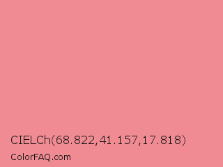CIELCh 68.822,41.157,17.818 Color is a light red color and the nearest color is Geraldine #fb8989. Hex code #f08b93 and RGB value is rgb(240,139,147). In RGB color space, this color is composed of 94% red, 55% green, 58% blue, In CMYK color space, this color is composed of 0% cyan, 42% magenta, 39% yellow , 6% black , In HSL color space, this color has a hue angle of 355° , 77% saturation and 74% lightness.