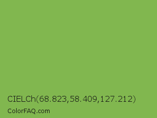 CIELCh 68.823,58.409,127.212 Color is a normal green color and the nearest color is Bud Green #7bb661. Hex code #81b74f and RGB value is rgb(129,183,79). In RGB color space, this color is composed of 51% red, 72% green, 31% blue, In CMYK color space, this color is composed of 30% cyan, 0% magenta, 57% yellow , 28% black , In HSL color space, this color has a hue angle of 91° , 42% saturation and 51% lightness.