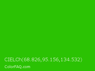 CIELCh 68.826,95.156,134.532 Color is a normal green color and the nearest color is Harlequin Green #46cb18. Hex code #2bc203 and RGB value is rgb(43,194,3). In RGB color space, this color is composed of 17% red, 76% green, 1% blue, In CMYK color space, this color is composed of 78% cyan, 0% magenta, 98% yellow , 24% black , In HSL color space, this color has a hue angle of 107° , 97% saturation and 39% lightness.