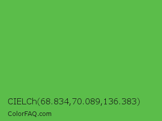 CIELCh 68.834,70.089,136.383 Color is a normal green color and the nearest color is Apple #4fa83d. Hex code #5bbd4a and RGB value is rgb(91,189,74). In RGB color space, this color is composed of 36% red, 74% green, 29% blue, In CMYK color space, this color is composed of 52% cyan, 0% magenta, 61% yellow , 26% black , In HSL color space, this color has a hue angle of 111° , 47% saturation and 52% lightness.