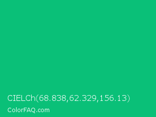 CIELCh 68.838,62.329,156.13 Color is a normal green color and the nearest color is Mountain Meadow Crayola #1ab385. Hex code #0ac078 and RGB value is rgb(10,192,120). In RGB color space, this color is composed of 4% red, 75% green, 47% blue, In CMYK color space, this color is composed of 95% cyan, 0% magenta, 38% yellow , 25% black , In HSL color space, this color has a hue angle of 156° , 90% saturation and 40% lightness.