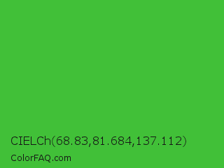 CIELCh 68.83,81.684,137.112 Color is a normal green color and the nearest color is Wageningen Green #34b233. Hex code #41c038 and RGB value is rgb(65,192,56). In RGB color space, this color is composed of 25% red, 75% green, 22% blue, In CMYK color space, this color is composed of 66% cyan, 0% magenta, 71% yellow , 25% black , In HSL color space, this color has a hue angle of 116° , 55% saturation and 49% lightness.