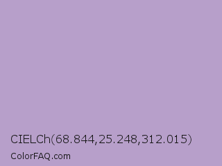 CIELCh 68.844,25.248,312.015 Color is a light purple color and the nearest color is London Hue #bea6c3. Hex code #b79fca and RGB value is rgb(183,159,202). In RGB color space, this color is composed of 72% red, 62% green, 79% blue, In CMYK color space, this color is composed of 9% cyan, 21% magenta, 0% yellow , 21% black , In HSL color space, this color has a hue angle of 273° , 29% saturation and 71% lightness.