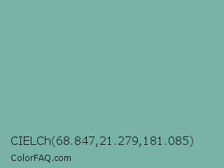 CIELCh 68.847,21.279,181.085 Color is a normal cyan color and the nearest color is Acapulco #7cb0a1. Hex code #79b3a8 and RGB value is rgb(121,179,168). In RGB color space, this color is composed of 47% red, 70% green, 66% blue, In CMYK color space, this color is composed of 32% cyan, 0% magenta, 6% yellow , 30% black , In HSL color space, this color has a hue angle of 169° , 28% saturation and 59% lightness.