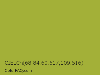CIELCh 68.84,60.617,109.516 Color is a normal yellow color and the nearest color is Android Green #a4c639. Hex code #a3b038 and RGB value is rgb(163,176,56). In RGB color space, this color is composed of 64% red, 69% green, 22% blue, In CMYK color space, this color is composed of 7% cyan, 0% magenta, 68% yellow , 31% black , In HSL color space, this color has a hue angle of 67° , 52% saturation and 45% lightness.