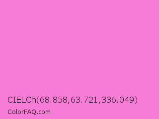 CIELCh 68.858,63.721,336.049 Color is a light magenta color and the nearest color is Princess Perfume #ff85cf. Hex code #f77cd8 and RGB value is rgb(247,124,216). In RGB color space, this color is composed of 97% red, 49% green, 85% blue, In CMYK color space, this color is composed of 0% cyan, 50% magenta, 13% yellow , 3% black , In HSL color space, this color has a hue angle of 315° , 88% saturation and 73% lightness.
