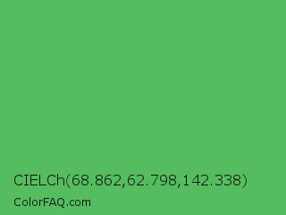 CIELCh 68.862,62.798,142.338 Color is a normal green color and the nearest color is Fern #63b76c. Hex code #55bd5f and RGB value is rgb(85,189,95). In RGB color space, this color is composed of 33% red, 74% green, 37% blue, In CMYK color space, this color is composed of 55% cyan, 0% magenta, 50% yellow , 26% black , In HSL color space, this color has a hue angle of 126° , 44% saturation and 54% lightness.