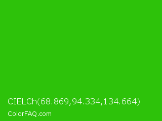 CIELCh 68.869,94.334,134.664 Color is a normal green color and the nearest color is Harlequin Green #46cb18. Hex code #2dc20a and RGB value is rgb(45,194,10). In RGB color space, this color is composed of 18% red, 76% green, 4% blue, In CMYK color space, this color is composed of 77% cyan, 0% magenta, 95% yellow , 24% black , In HSL color space, this color has a hue angle of 109° , 90% saturation and 40% lightness.