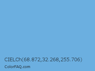 CIELCh 68.872,32.268,255.706 Color is a light blue color and the nearest color is Little Boy Blue #6ca0dc. Hex code #6bafe0 and RGB value is rgb(107,175,224). In RGB color space, this color is composed of 42% red, 69% green, 88% blue, In CMYK color space, this color is composed of 52% cyan, 22% magenta, 0% yellow , 12% black , In HSL color space, this color has a hue angle of 205° , 65% saturation and 65% lightness.