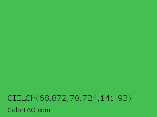 CIELCh 68.872,70.724,141.93 Color is a normal green color and the nearest color is Chateau Green #40a860. Hex code #45bf54 and RGB value is rgb(69,191,84). In RGB color space, this color is composed of 27% red, 75% green, 33% blue, In CMYK color space, this color is composed of 64% cyan, 0% magenta, 56% yellow , 25% black , In HSL color space, this color has a hue angle of 127° , 49% saturation and 51% lightness.