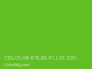 CIELCh 68.878,80.97,129.329 Color is a normal green color and the nearest color is Green RYB #66b032. Hex code #63bd24 and RGB value is rgb(99,189,36). In RGB color space, this color is composed of 39% red, 74% green, 14% blue, In CMYK color space, this color is composed of 48% cyan, 0% magenta, 81% yellow , 26% black , In HSL color space, this color has a hue angle of 95° , 68% saturation and 44% lightness.