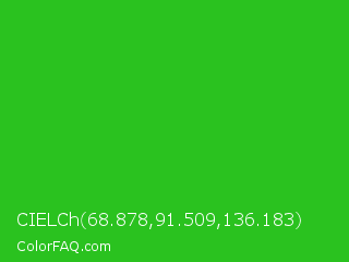 CIELCh 68.878,91.509,136.183 Color is a normal green color and the nearest color is Lime Green #32cd32. Hex code #2ac21f and RGB value is rgb(42,194,31). In RGB color space, this color is composed of 16% red, 76% green, 12% blue, In CMYK color space, this color is composed of 78% cyan, 0% magenta, 84% yellow , 24% black , In HSL color space, this color has a hue angle of 116° , 72% saturation and 44% lightness.