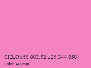 CIELCh 68.883,52.126,344.858 Color is a light magenta color and the nearest color is Persian Pink #f77fbe. Hex code #f383c2 and RGB value is rgb(243,131,194). In RGB color space, this color is composed of 95% red, 51% green, 76% blue, In CMYK color space, this color is composed of 0% cyan, 46% magenta, 20% yellow , 5% black , In HSL color space, this color has a hue angle of 326° , 82% saturation and 73% lightness.