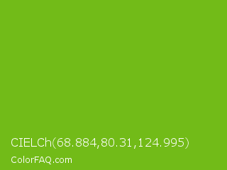 CIELCh 68.884,80.31,124.995 Color is a normal green color and the nearest color is Lima #76bd17. Hex code #72bb18 and RGB value is rgb(114,187,24). In RGB color space, this color is composed of 45% red, 73% green, 9% blue, In CMYK color space, this color is composed of 39% cyan, 0% magenta, 87% yellow , 27% black , In HSL color space, this color has a hue angle of 87° , 77% saturation and 41% lightness.