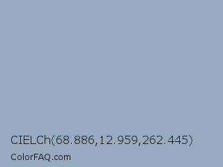 CIELCh 68.886,12.959,262.445 Color is a light blue color and the nearest color is Gull Gray #9dacb7. Hex code #98aabf and RGB value is rgb(152,170,191). In RGB color space, this color is composed of 60% red, 67% green, 75% blue, In CMYK color space, this color is composed of 20% cyan, 11% magenta, 0% yellow , 25% black , In HSL color space, this color has a hue angle of 212° , 23% saturation and 67% lightness.