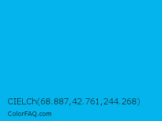 CIELCh 68.887,42.761,244.268 Color is a normal blue color and the nearest color is Cyan Process #00b7eb. Hex code #04b5ed and RGB value is rgb(4,181,237). In RGB color space, this color is composed of 2% red, 71% green, 93% blue, In CMYK color space, this color is composed of 98% cyan, 24% magenta, 0% yellow , 7% black , In HSL color space, this color has a hue angle of 194° , 97% saturation and 47% lightness.