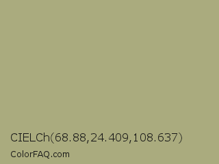 CIELCh 68.88,24.409,108.637 Color is a normal yellow color and the nearest color is Hillary #aca586. Hex code #aaab7e and RGB value is rgb(170,171,126). In RGB color space, this color is composed of 67% red, 67% green, 49% blue, In CMYK color space, this color is composed of 1% cyan, 0% magenta, 26% yellow , 33% black , In HSL color space, this color has a hue angle of 61° , 21% saturation and 58% lightness.