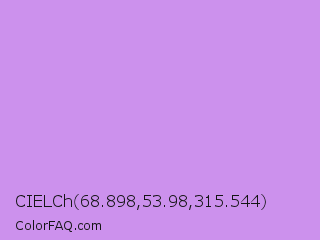 CIELCh 68.898,53.98,315.544 Color is a light purple color and the nearest color is Bright Lilac #d891ef. Hex code #cc91ed and RGB value is rgb(204,145,237). In RGB color space, this color is composed of 80% red, 57% green, 93% blue, In CMYK color space, this color is composed of 14% cyan, 39% magenta, 0% yellow , 7% black , In HSL color space, this color has a hue angle of 278° , 72% saturation and 75% lightness.