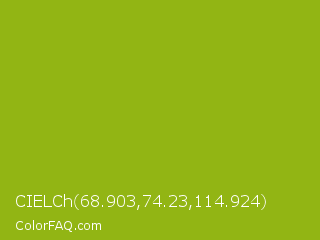 CIELCh 68.903,74.23,114.924 Color is a normal lime color and the nearest color is Pistachio Green #9dc209. Hex code #92b514 and RGB value is rgb(146,181,20). In RGB color space, this color is composed of 57% red, 71% green, 8% blue, In CMYK color space, this color is composed of 19% cyan, 0% magenta, 89% yellow , 29% black , In HSL color space, this color has a hue angle of 73° , 80% saturation and 39% lightness.